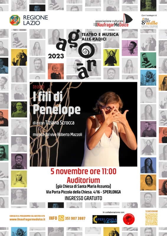 Questo tour si conclude nell'auditorium di Sperlonga, giorno 5 novembre alle ore 11, con il pluripremiato monologo di Tiziana Scrocca "I fili di Penelope", intensa e attuale opera ispirata all'Odissea e incorniciata dalla scenografia naturale della Riviera di Ulisse.