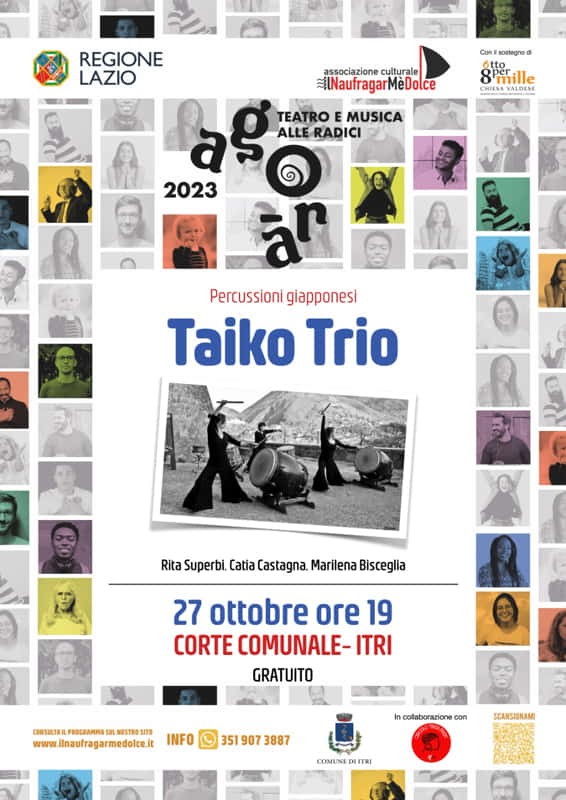 Il primo spettacolo a Itri, presso la corte comunale alle ore 19 del 27 ottobre, vede l'esibizione del Taiko trio in un concerto di percussioni su tipici tamburi della cultura giapponese intrecciati a ritmi e movenze della nostra tradizione popolare. Un'esperienza multisensoriale che coinvolgerà il pubblico in modo inaspettato.