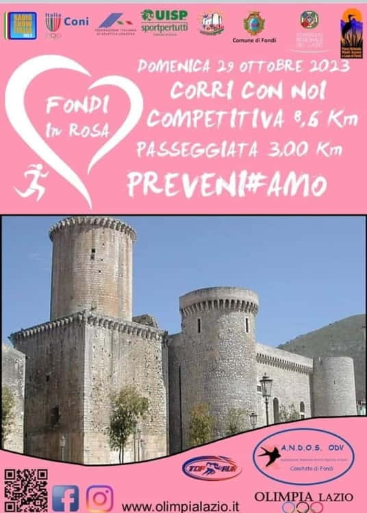 Tutto pronto per “FONDI IN ROSA”, la gara podistica nazionale di 8,6 Km che si terrà domenica 29 ottobre a Fondi per sostenere la lotta al tumore al seno. Parallelamente alla corsa competitiva si svolgerà una passeggiata aperta a tutti, persino ad anziani, bambini e mamme con passeggini al seguito, di 3 chilometri complessivi. Quest’ultima percorrerà le stradine del centro storico e avrà lo scopo di veicolare in maniera capillare un forte messaggio di sensibilizzazione.