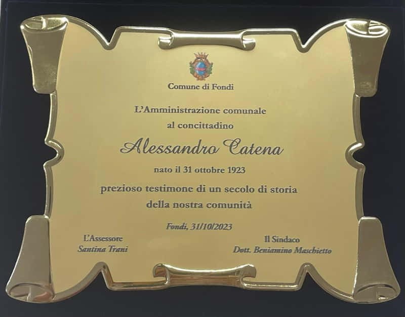 Il festeggiato e i suoi familiari hanno infatti ricordato gli anni della Seconda Guerra Mondiale durante i quali è stato fatto prigioniero sul fronte greco e deportato dapprima nei campi di concentramento in Grecia e, successivamente, in Germania, a Buchenwald, dove è rimasto ristretto per tre lunghissimi anni. Tornato in Italia, Alessandro Catena ha lavorato come bracciante agricolo e nel 1970, nonostante la lunghissima permanenza nel lager tedesco, è tornato in Germania per lavorare prima in fabbrica e poi presso l'ufficio postale dove è rimasto fino al 1980. Tornato di nuovo in Italia, ha condotto l’azienda agricola insieme alla moglie ed ha avviato una fiorente attività di commercio al dettaglio presso il mercato rionale di Terracina.