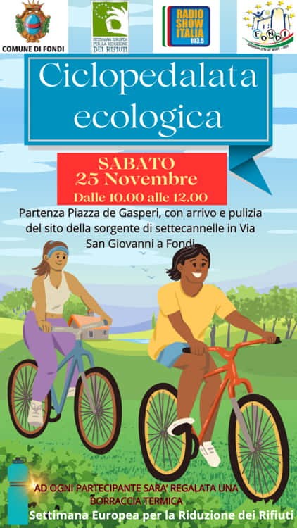 La settimana proseguirà con una pedalata ecologica in programma sabato 25 novembre con partenza alle ore 10:00 da Piazza de Gasperi e arrivo alle ore 12:00 presso la sorgente di Sette Cannelle (via San Giovanni) dove tutti i ciclisti parcheggeranno la due ruote per dedicarsi alla pulizia del sito.