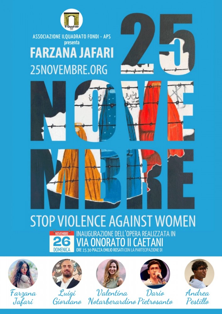 Domenica 26 Novembre, alle ore 15.30, in Via Onorato II Caetani, nel cuore del Centro Storico di Fondi sarà inaugurata ufficialmente l'opera di arte urbana realizzata dall'artista afghana Farzana Jafari per il Progetto 25Novembre.org sostenuto dall'Associazione Il Quadrato Fondi - APS. Un'iniziativa che dal 2014 ad oggi ha permesso la realizzazione in Città di nove opere sul tema, con artisti di fama nazionale ed internazionale.