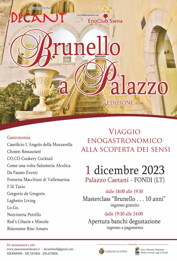 Mancano poche ore a Brunello a Palazzo, l’evento che porta a Fondi (LT) il Brunello di Montalcino per accostarlo alle eccellenze gastronomiche del territorio pontino, giunge alla settima edizione.