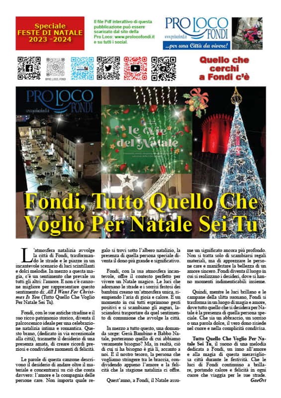 È stato pubblicato a cura dell'Associazione Pro Loco Aps, in collaborazione con il Comune di Fondi, Speciale Natale 2023, il pieghevole interamente dedicato alle festività natalizie.