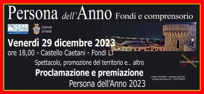 La cerimonia di premiazione dell'undicesima edizione si svolgerà venerdì 29 dicembre 2023 con inizio alle ore 18,00 nella Sala del Castello Caetani a Fondi LT, con la proclamazione della "Persona dell'anno” 2023, spettacolo, promozione del territorio e… altro.