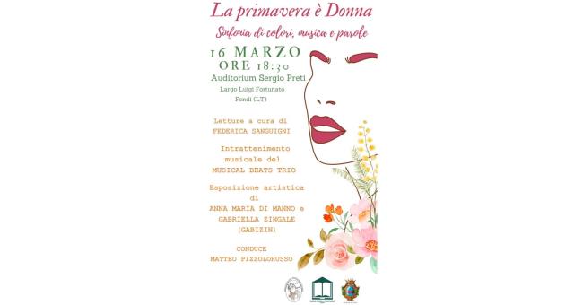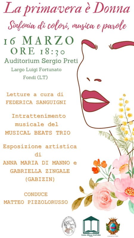 Sabato 16 Marzo 2024, alle ore 18,30, presso l’Auditorium “Sergio Preti” a Fondi, un evento dedicato all’imminente arrivo della Primavera e alla Donna.