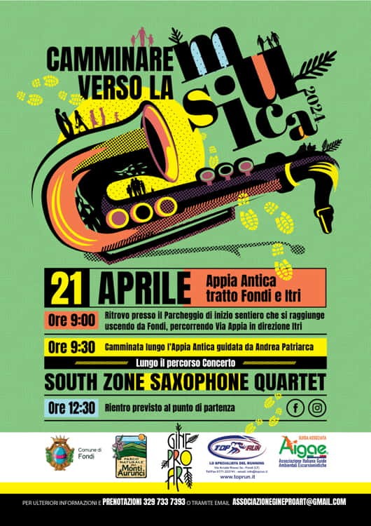 Domenica 21 Aprile si andrà alla scoperta del sito naturalistico dell’Appia Antica, nel tratto tra Fondi e Itri, protetto dall’Ente Parco Regionale Naturale Monti Aurunci. I partecipanti si riuniranno alle ore 9.00, per poi partire alle ore 9.30 alla scoperta di questo tratto dell’antica Via Appia ricco di storia e non solo. L’escursione sarà guidata da Andrea Patriarca- guida AIGAE- e, lungo il sentiero, si terrà il concerto del quartetto di saxofoni South Zone Saxophone Quartet composto dai musicisti Luciano Bonanni sax soprano, Danilo Florimondo Lidano sax alto, Armando Mancini sax tenore e Laura Venditti sax baritono.