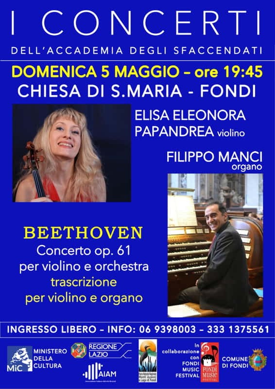 Il primo appuntamento si terrà presso la Chiesa di Santa Maria, grazie all’ospitalità del Parroco Don Sandro Guerriero appassionato cultore di Musica, e vedrà impegnati due concertisti di vaglia - la violinista Elisa Eleonora Papandrea e l’organista Filippo Manci - che faranno ascoltare due capolavori beethoveniani in una veste particolare: la trascrizione per organo della partitura sinfonica del Concerto per violino e orchestra in re maggiore op.61 (ad opera dello stesso Filippo Manci) e la trascrizione per organo ottocentesca del primo movimento della Quinta Sinfonia in do minore op.67.