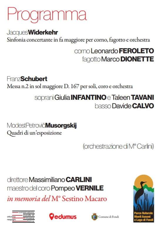 Sabato 8 Giugno, alle ore 18:30, invece, il Maestro verrà celebrato con l’apposizione di una targa commemorativa in Via San Gaetano, dove ha vissuto ed esercitato la professione di Maestro di Musica per tutta la sua vita. L’evento è promosso dal Conservatorio e dal Portale Edumus con il patrocinio del Comune di Fondi e del Parco naturale regionale dei Monti Ausoni e Lago di Fondi.