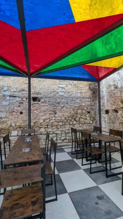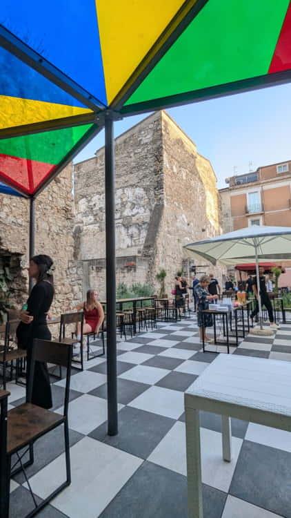Pavimentazione a scacchi e pensilina in plexiglass richiamano, in chiave moderna, il cromatismo dell'antica struttura sacra, in particolare il mosaico pavimentale e il rosone. Una parte del mosaico, riemerso e recuperato durante i lavori, è ancora visibile accanto all'ingresso così come sono ancora visibili i segni delle ex navate originarie, risalenti al XIV secolo