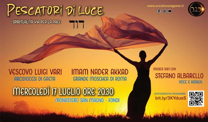 Prendendo spunto dalla Lettera Pastorale dell’Arcivescovo di Gaeta Luigi Vari dal titolo “Pescatori di Luce”, quest’anno il percorso intende riportare al centro il tema della “spiritualità” come via maestra per la pace e il dialogo fra i popoli e le religioni. Appuntamento per mercoledì 17 luglio 2024 alle ore 20.30 presso il Monastero San Magno in Fondi, luogo fortemente caratterizzato da una profonda spiritualità che invita al dialogo e all’incontro.