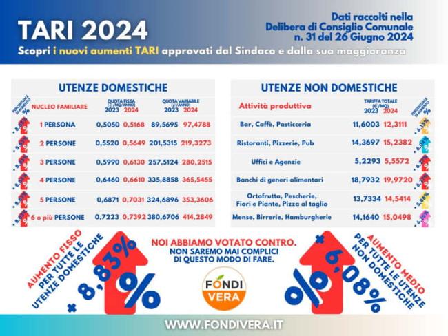 Come anticipato nelle scorse settimane, uno studio approfondito dei documenti ci permette di definire puntualmente gli aumenti tariffari che Fondi Vera e le altre forze di Opposizione hanno sonoramente bocciato in occasione della seduta di Consiglio di fine Giugno, votati favorevolmente da Forza Italia e gli altri gruppi che compongono la maggioranza.