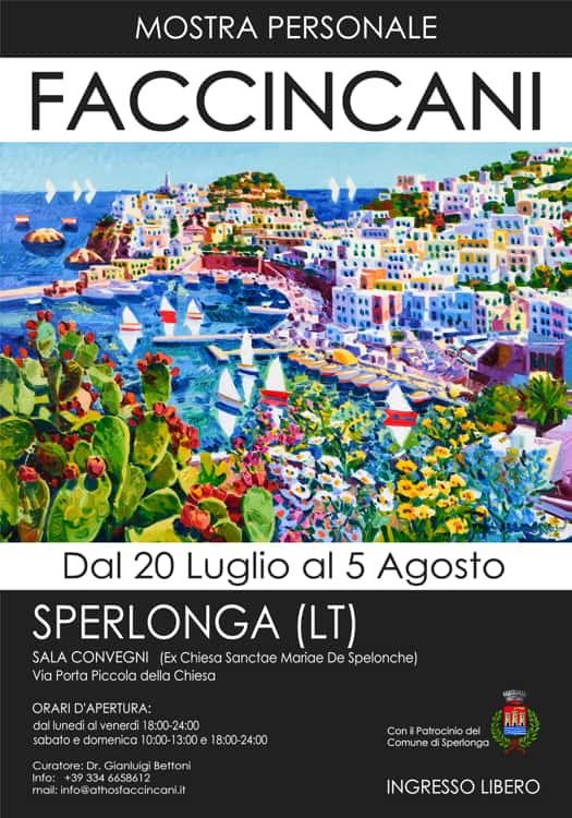 L’ex Chiesa Sanctae Mariae de Spelonche, ora Sala Convegni situata nel borgo di Sperlonga, ospiterà la personale del Maestro Athos Faccincani che si aprirà sabato 20 Luglio con il Patrocinio del Comune di Sperlonga.