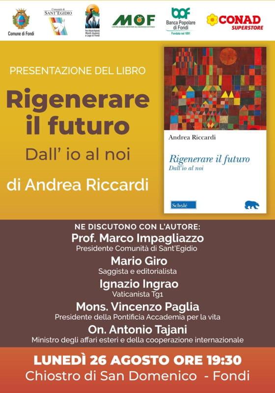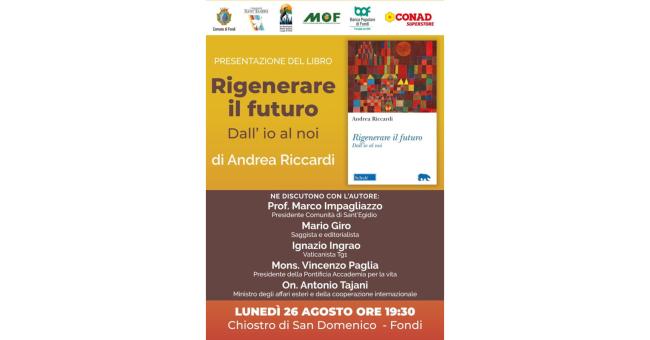 Anche quest’anno – commenta il sindaco di Fondi Beniamino Maschietto – l’autore Andrea Riccardi ci ricorda di fermarci e far prevalere la riflessione sulla frenesia della vita e, soprattutto, sull’individualismo. Uno dopo l’altro, gli accadimenti internazionali che stanno sconvolgendo il nostro pianeta si stanno susseguendo senza soluzione di continuità e noi non possiamo restare inermi e indifferenti. Incontri come questo, che sono lieto di ospitare ogni anno nella nostra città, ci aiutano a tenere deste le coscienze, a fare ogni giorno la differenza e ad avviare, nel nostro io, una piccola rivoluzione interiore. Il prossimo 26 agosto sarà un’opportunità culturale per la nostra città e per tutti coloro che vorranno assistere all'evento. Un sentito ringraziamento va quindi alla Comunità di Sant'Egidio, realtà nata nel 1968 allo scopo di aiutare i bisognosi di tutto il mondo, che ogni giorno cerca di fare la differenza.