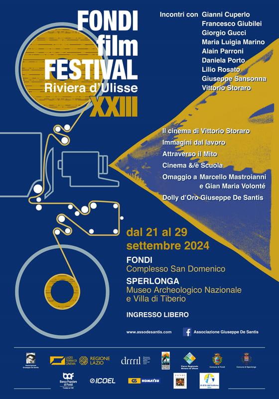 Per ilFONDIfilmFESTIVAL - Riviera d’Ulisse XXIII edizione l’Associazione Giuseppe De Santis ha partecipato nel luglio scorso all’avviso pubblico “Lazio Terra di Cinema” della Regione Lazio ed è in attesa di conoscere l’esito dell’istanza. Allo stato attuale, l’iniziativa si avvale del patrocinio e del contributo dei Comuni di Fondi e Sperlonga, del patrocinio di Ente Parco Regionale dei Monti Ausoni e Lago di Fondi ed Ente Parco Regionale Riviera di Ulisse e della collaborazione di Direzione Regionale Musei Nazionali Lazio, Associazione Al di là dell’Autismo ODV e UniTre Fondi. Main sponsor sono la Banca Popolare di Fondi, ICOEL e GIS - Grassi Industrial Services.