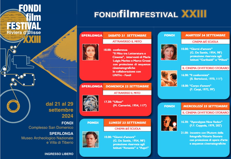 La kermesse, che si prefigge anche la promozione e valorizzazione turistica del paesaggio e dei beni storico-architettonici della Riviera d’Ulisse, avrà inizio sabato 21 e domenica 22 settembre presso il Museo Archeologico Nazionale e Villa di Tiberio di Sperlonga, che ospiterà la sezione “Attraverso il Mito”, nell’ambito della quale si terrà la conferenza di Maria Luigia Marino e Marco Grossi dal titolo “Il Mito tra Letteratura e Cinema”, impreziosita da sequenze cinematografiche, e sarà proiettato il film “Ulisse” (Mario Camerini, 1954), proposto in occasione del suo 70° anniversario.