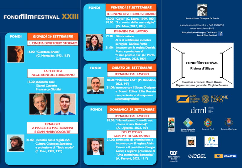 Tra le numerose proposte dell’edizione 2024 del FFF, l’incontro “La politica negli anni del terrorismo”, che vedrà protagonisti in dialogo con Virginio Palazzo due esponenti di differenti schieramenti, il deputato PD Gianni Cuperlo e il presidente della Fondazione Tatarella Francesco Giubilei, cui seguiranno l’incontro con il regista RAI Cultura Giuseppe Sansonna e la proiezione del film “maledetto” di Elio Petri “Todo modo” (1976), proposto in occasione di due anniversari inerenti i protagonisti principali della pellicola: il centenario della nascita di Marcello Mastroianni e il trentennale della scomparsa di Gian Maria Volonté. E ancora, la conversazione con Lilio Rosato, uno dei più validi Sound Designer e Sound Editor del cinema italiano, quattro volte candidato ai David di Donatello, collaboratore principe di registi del calibro di Marco Bellocchio e Marco Tullio Giordana che ha all’attivo anche collaborazioni con Giuseppe Tornatore (“La leggenda del pianista sull’oceano”, 1998) e Mel Gibson (“La passione di Cristo”, 2004); le proiezioni delle sezioni “Immagini dal lavoro” – che ospiterà la regista esordiente Daniela Porto, co-autrice del film “Il mio posto è qui” (2024) – e “Cinema &/è Scuola” e, nella giornata conclusiva, la cerimonia di premiazione del Dolly d’Oro Giuseppe De Santis, che sarà assegnato al giovanissimo esordiente Alain Parroni, regista di “Una sterminata domenica” (2023), film che ha ottenuto due premi alla Mostra Internazionale d’Arte Cinematografica di Venezia.