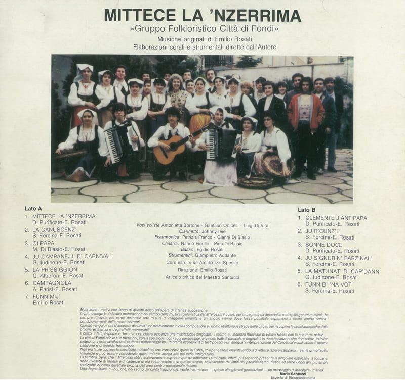 L'iniziativa nacque grazie all'intuizione e alla dedizione del compianto Padre Alessio Falanga, allora parroco della chiesa di San Francesco di Fondi, che, in collaborazione con la Pro Loco Fondi, volle fortemente dare vita a questo progetto. Il risultato fu un'esperienza musicale e umana coinvolgente, capace di unire decine di persone attorno alla passione per la tradizione e il senso di appartenenza alla propria comunità. In quarant'anni, “Mìttece la 'nzerrima” è rimasto l'unico album inciso interamente dedicato al folklore fondano, una produzione artistica che conserva la forza e il valore simbolico delle antiche melodie e storie popolari.