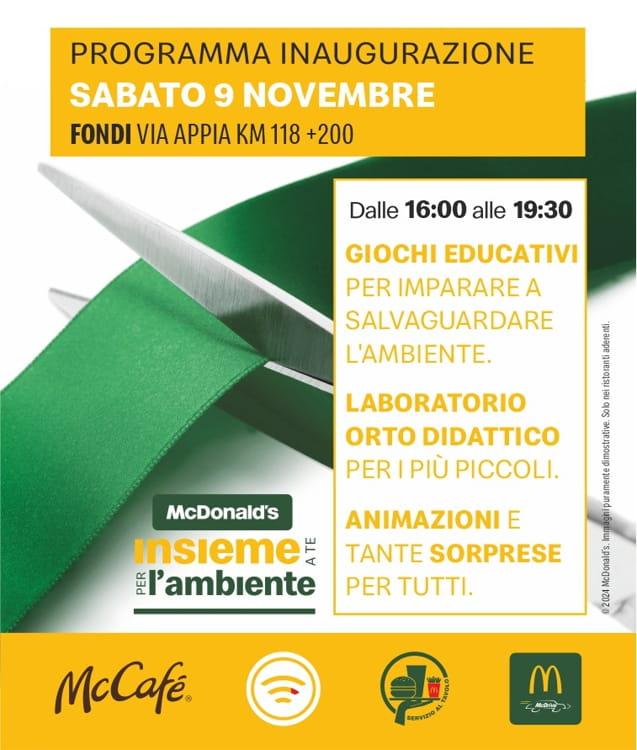Finalmente in programma l’inaugurazione del nuovo MC Donald’s di Fondi, un nuovo mondo a misura del cliente nel rispetto della qualità enogastronomica e della sostenibilità ambientale. Sabato 9 novembre il ristorante, sito in via Appia km 118+200, sarà teatro di una “Festa di Inaugurazione”, nel segno dello slogan “Mc Donald’s insieme a te per l’ambiente”.