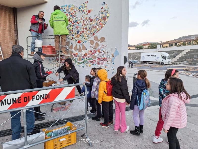 Cinque giorni di impegno, la preziosissima collaborazione di Nocella Bruno - Edilizia Minturnese, di Enrico Silvestri, Luca Teseo e Patrizio Di Biasio, degli infaticabili Sandro Macaro e Massimo Capotosto, di Patrizia ed Ernesto Paparello, e di Gennaro Vitiello. Un lavoro di squadra che è stato premiato dalla bellissima risposta di pubblico durante la Cerimonia inaugurale del 25 Novembre, e dalla emozionante visita dei bambini delle Scuole che hanno risposto al nostro appello, ed in particolar modo l'Aspri e la Don Milani. Ma anche e soprattutto dall'aiuto fornito dalle ragazze e dai ragazzi del Centro Diurno Disabili "L'Allegra Brigata" che hanno dimostrato di apprendere subito la tecnica del Trencadís.