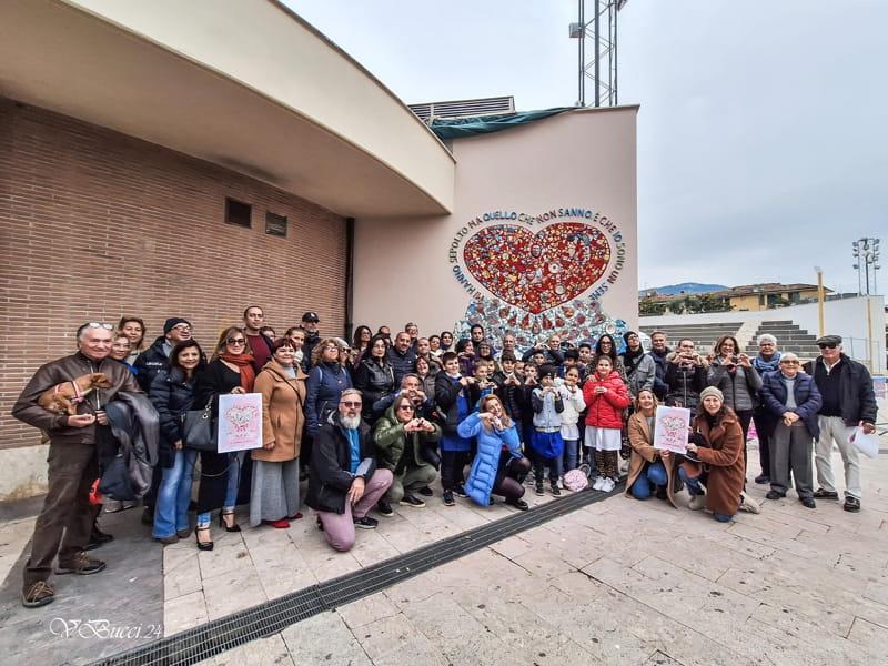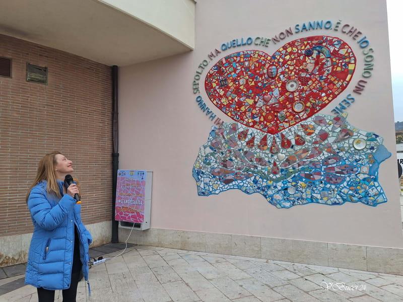 Un'opera di tutti, di cui tutto spero si prendano cura - racconta Lucia Paparello. - "Mi hanno sepolto ma loro non sanno che io sono un seme" è la citazione che avvolge un grande cuore frantumato, rotto, ferito che gocciola sangue. Le sue gocce vanno a confluire in un fiore di mandorlo, simbolo di vita e di speranza, che innalza i suoi petali verso il cuore. Un percorso di guarigione e di speranza che segue un cuore frantumato. Sia il mandorlo, con i suoi sottili petali e la sua fioritura precoce, sia il cuore, con le sue emozioni intense, sono simboli di fragilità, ma allo stesso tempo di forza, di vita e di speranza come un seme che rinasce - ha spiegato l'artista durante la Cerimonia inaugurale, alla presenza anche di diversi rappresentanti istituzionali.