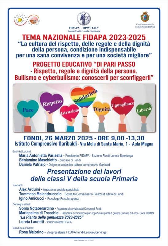 Si terrà mercoledì 26 marzo, dalle 9:00 alle 13:30, presso l’aula magna dell’Istituto comprensivo Garibaldi, la giornata conclusiva del progetto educativo “Di pari passo – Rispetto, regole e dignità della persona.Bullismo e cyberbullismo: conoscerli per sconfiggerli” promosso dalla sezione Fondi – Lenola – Sperlonga della FIDAPA.