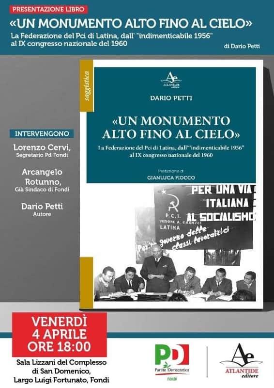 “Un monumento alto fino al cielo. La Federazione del Pci di Latina dall'indimenticabile 1956” al IX congresso nazionale del 1960” ultimo saggio storico di Dario Petti, edito da Atlantide, per la prima volta sarà presentato nel sud pontino, precisamente a Fondi, in un evento organizzato dalla locale sezione del Partito democratico, programmato per venerdì 4 aprile alle ore 18:00 nella sala Lizzani del bel Complesso di San Domenico, in largo Luigi Fortunato, dove annualmente l’Associazione Beppe De Santis svolge il Film Festival di Fondi, un contesto suggestivo visto anche il legame diretto di Lizzani e di De Santis con il Pci. Ad affiancare l’autore Dario Petti, saranno Lorenzo Cervi, giovane segretario del Pd fondano, studente universitario in Scienze storiche e Arcangelo Rotunno, già sindaco di Fondi, figura storica del Pci prima e del Pds poi.