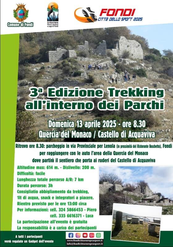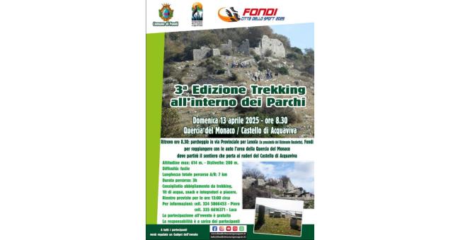 Torna “Trekking all’interno dei Parchi”, l’evento sportivo e naturalistico dedicato alle aree protette della Piana di Fondi ormai giunto alla sua terza edizione. L’appuntamento con l’escursione primaverile amata da grandi e piccini è per domenica 13 aprile alle 8:30. Destinazione: Quercia del Monaco e Ruderi di Acquaviva.
