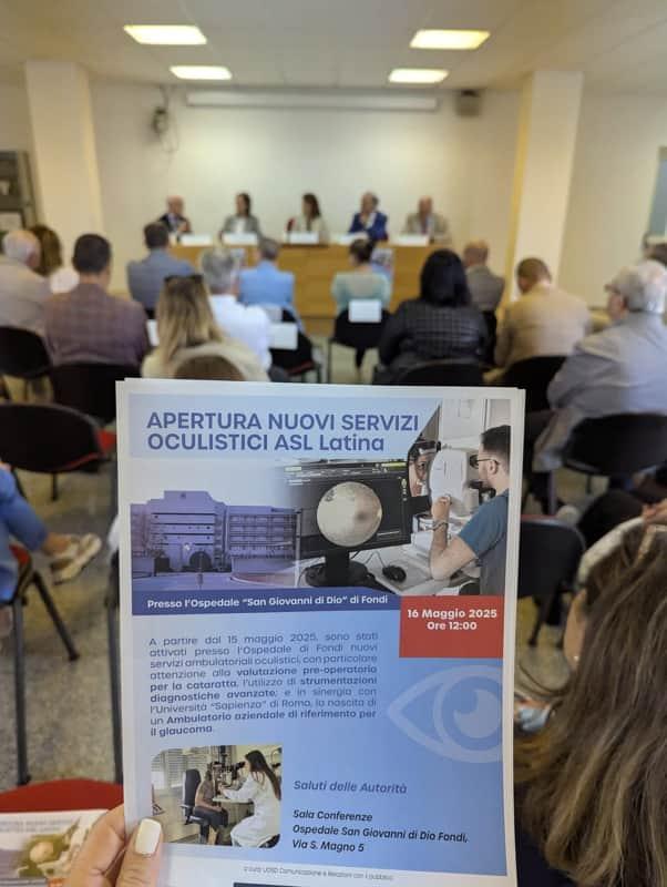 Sono stati inaugurati lo scorso venerdì 15 maggio, presso l'ospedale "San Giovanni di Dio di Fondi", nuovi servizi ambulatoriali oculistici. Al taglio del nastro sono stati presenti, oltre al sindaco di Fondi Beniamino Maschietto e alla manager Asl Sabrina Cenciarelli, l'assessore regionale Elena Palazzo, i direttori sanitari Giuseppe Ciarlo e Fabrizio Turchetta e il responsabile del servizio, il professor Enzo Maria Vingolo.