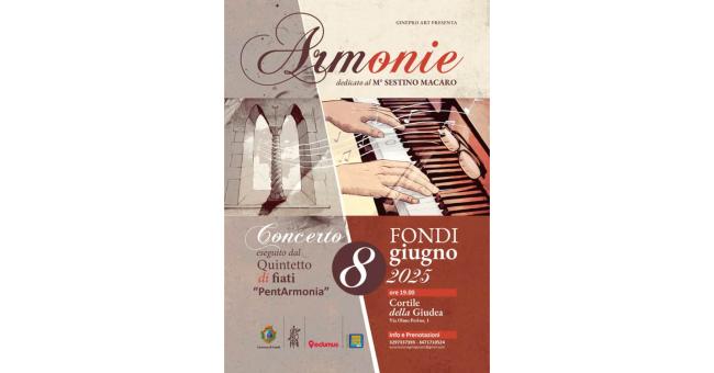 L'appuntamento è per domenica 8 giugno alle ore 19.00, nello splendido Cortile della Giudea in via Olmo Perino a Fondi. A esibirsi sarà il quintetto di fiati PentArmonia, composto da musicisti che con il Maestro hanno condiviso non solo il percorso formativo, ma anche legami personali profondi.