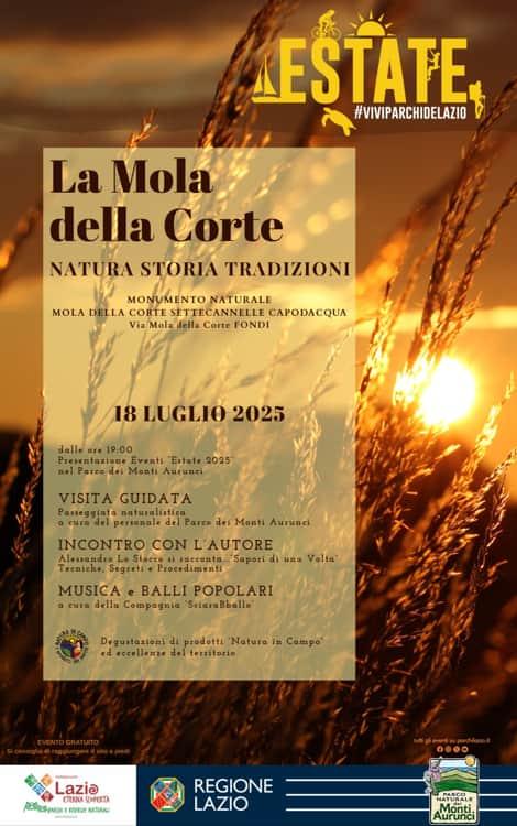 Il Parco Naturale dei Monti Aurunci apre il calendario degli eventi estivi “Estate 2025 #viviparchidelazio” con una serata dedicata alla riscoperta dei sapori, delle tradizioni e delle bellezze naturalistiche del territorio. L’appuntamento è per venerdì 18 luglio 2025 al Monumento Naturale Mola della Corte Settecannelle Capodacqua, in via Mola della Corte a Fondi.