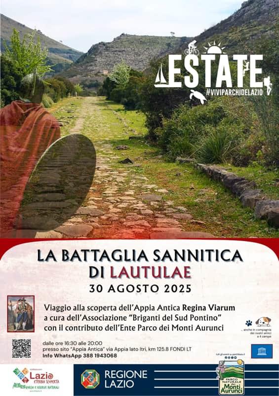Nello stesso giorno, sempre sabato 30 agosto 2025, dalle ore 16:30 alle 20:00, l’appuntamento è lungo l’antica Via Appia (km 125.8, lato Itri – Fondi) per una rievocazione che farà rivivere uno degli scontri più celebri della storia romana: la Battaglia di Lautulae.