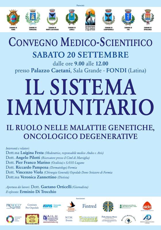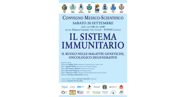 Sabato 20 settembre, a partire dalle ore 9:00, la splendida cornice di Palazzo Caetani – Sala Grande a Fondi (Latina) ospiterà un importante Convegno Medico-Scientifico dedicato al tema “Il sistema immunitario: il ruolo nelle malattie genetiche, oncologico degenerative”.