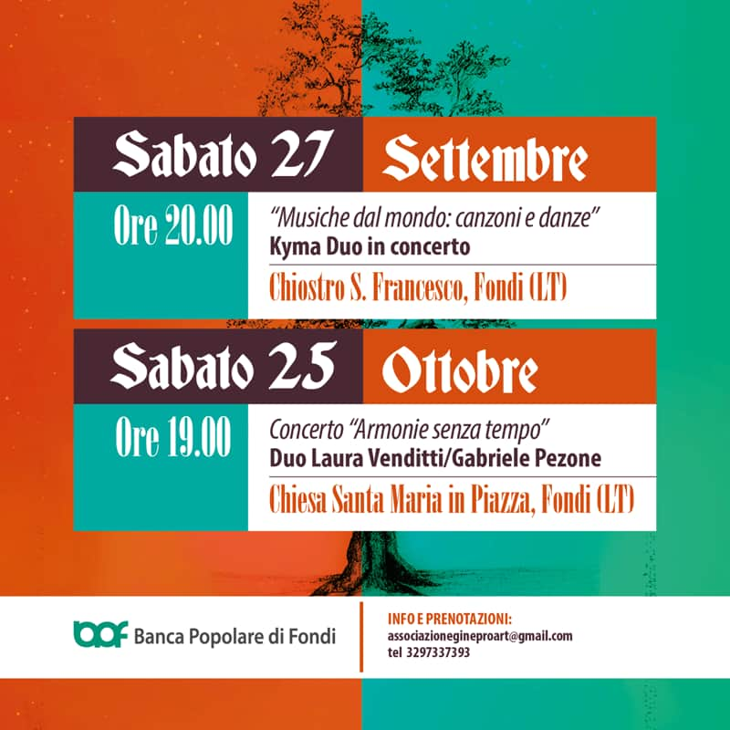 Il primo appuntamento si terrà sabato 27 settembre alle ore 20.00 nel suggestivo Chiostro della Chiesa di San Francesco a Fondi, con il concerto del Kyma Duo – Simone Salvatori alla chitarra e Laura Venditti ai saxofoni – che proporrà un coinvolgente programma dal titolo “Musiche dal mondo: canzoni e danze”.