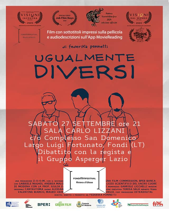 Dopo la proiezione mattutina riservata agli studenti delle Scuole Medie “Garibaldi” e Milani” di Fondi con ragazze e ragazzi attenti, ricettivi ed entusiasti, il docu-film “Ugualmente diversi” (2024) è nuovamente in programma sabato 27 settembre alle ore alle ore 21.00 in Sala Lizzani alla presenza dell’autrice, regista e produttrice Federika Ponnetti, che prima della proiezione incontrerà i componenti del gruppo Asperger Lazio.