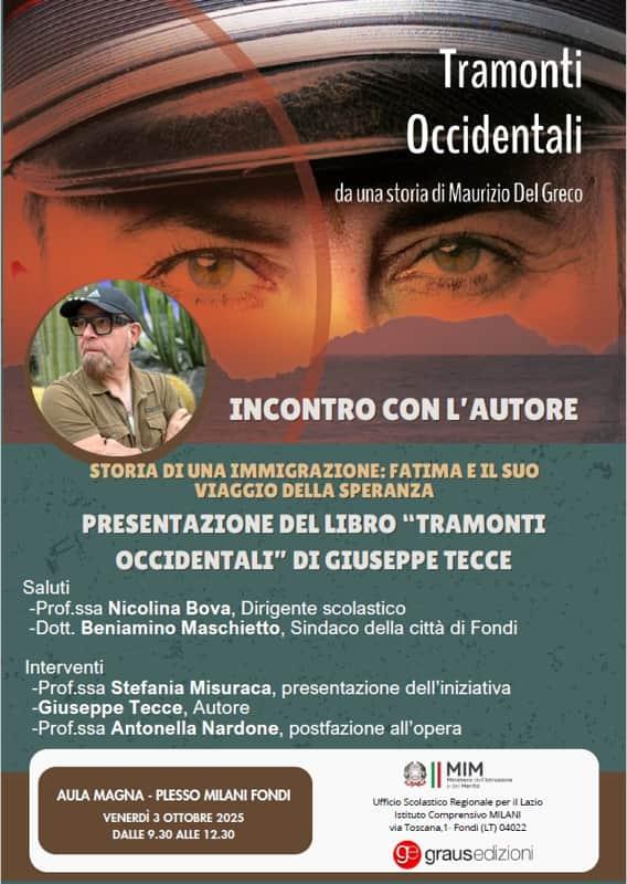 Si terrà venerdì 3 ottobre, alle ore 9:30 presso l’aula magna dell’Istituto comprensivo di Fondi “Milani”, un incontro con Giuseppe Tecce, autore del libro “Tramonti Occidentali”.