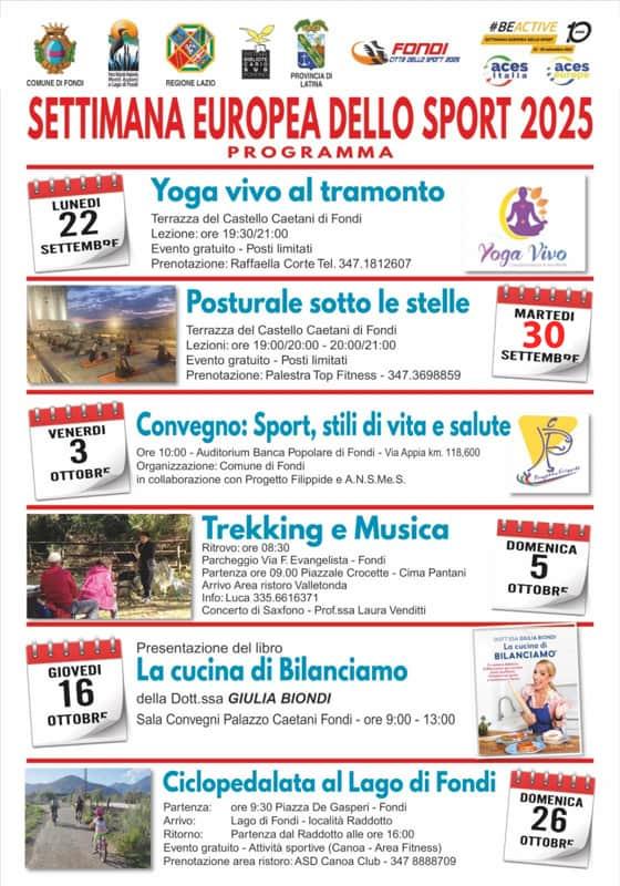Dallo yoga al trekking, dall’alimentazione alla natura, dalla musica al benessere psicofisico, dalla posturale al ciclismo passando per il fitness, l’attività agonistica e l’inclusione: questo evento – commentano il sindaco di Fondi Beniamino Maschietto e l’assessore allo Sport Fabrizio Macaro – si propone di dare massima espressione a quelli che sono gli obiettivi della Settimana Europea dello Sport. Si tratta di un’iniziativa straordinaria, che coinvolge ogni anno in tutta Europa decine di milioni di persone tra cittadini, famiglie, bambini, adolescenti e atleti, e anche Fondi ha voluto fare la sua parte. Com’è nella mission del programma abbiamo quindi pensato ad un’organizzazione che desse la possibilità a chiunque di scoprire nuove discipline, perfezionare le proprie abilità e condividere momenti di ispirazione con altri appassionati.