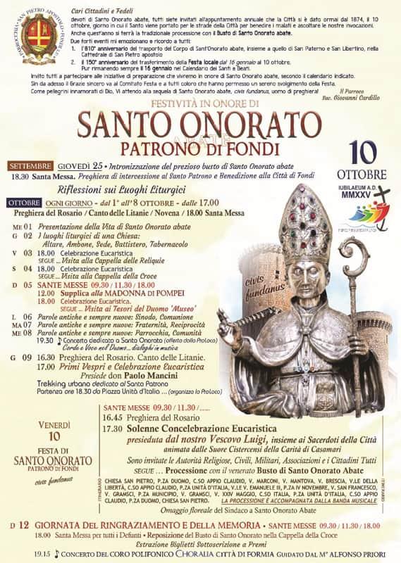 Oltre alle tradizionali celebrazioni religiose a cura della Parrocchia di San Pietro, si terranno anche una serie di eventi culturali e solidali promossi dal Comune di Fondi, dalla Pro Loco e dall’Associazionismo locale.