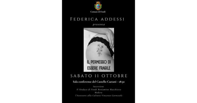 Si terrà sabato 11 ottobre, con inizio alle 18:30, presso la sala conferenze del Castello Caetani, la presentazione del libro “Il permesso di essere fragile”, scritto dall’autrice fondana Federica Addessi.