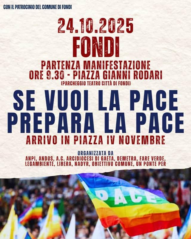 Convinti che una proiezione possa solo in parte far aggregare persone su un tema così profondo e ampio che va ben oltre Gaza, il Medio Oriente e anche l'Ucraina, abbiamo accettato la proposta del presidio di Libera del Sud Pontino e la mattina di venerdì 24 ottobre, saremo parte alla manifestazione per la pace promossa insieme ad altre realtà locali e con il patrocinio del Comune di Fondi. In questa occasione ci ritroveremo alle ore 9.30 in piazza Rodari, nel parcheggio antistante il teatro di Fondi, per poi proseguire in corteo fino a piazza IV Novembre (San Francesco).