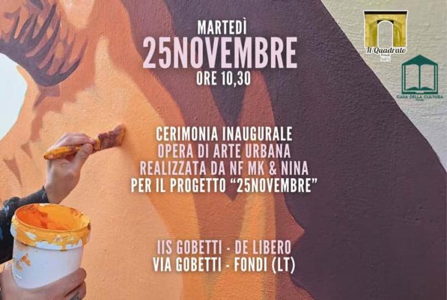 Anche quest’anno la Città di Fondi dice NO alla Violenza sulle Donne con diverse iniziative, in particolar modo per l'undicesimo anno consecutivo con il Progetto “25Novembre” promosso dall’Associazione “Il Quadrato Fondi – APS” in collaborazione con Enti e Istituzioni ma anche e soprattutto in sinergia con il mondo dell'associazionismo fondano. Progetto che vede nei panni di Testimonial 2025 Alessandra Monforte e che nella mattinata di Martedì 25 Novembre registrerà la Cerimonia inaugurale dell'opera di arte urbana in corso di realizzazione sulla parete dell'IIS Gobetti - De Libero in Via Gobetti. Opera a cura di Domenico Tirino e Caterina Ceccarelli, street artist di fama nazionale che hanno accolto il nostro invito e da alcuni giorni stanno lavorando per quello che diventerà un simbolo importante, soprattutto per le giovani generazioni.
