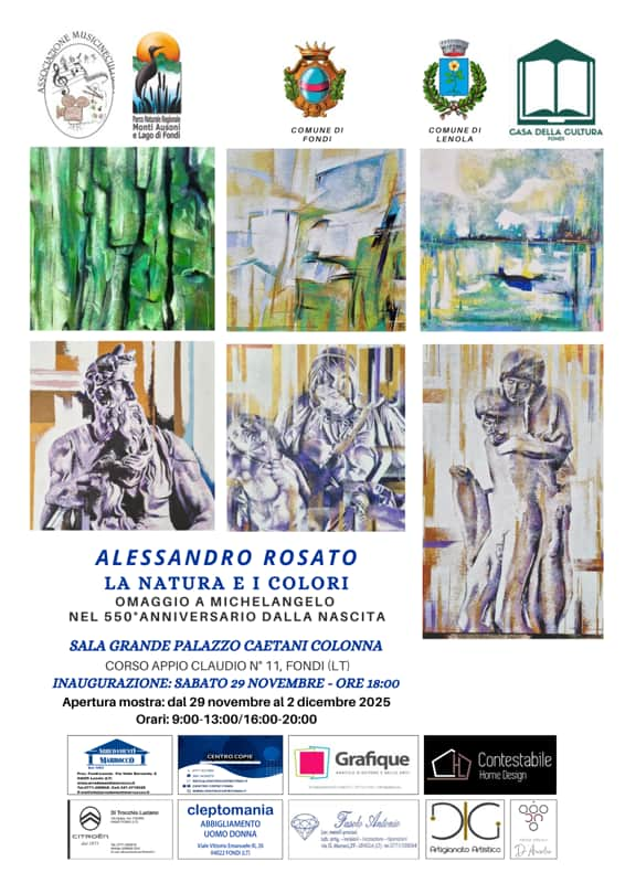 L'Associazione Musicinecultura APS, con il patrocinio del Parco Naturale Regionale Monti Ausoni e Lago di Fondi, del Comune di Fondi, del Comune di Lenola e della Casa della Cultura di Fondi, organizza e promuove la mostra di pittura ''La natura e i colori - Omaggio a Michelangelo nel 550° anniversario dalla nascita" di Alessandro Rosato.