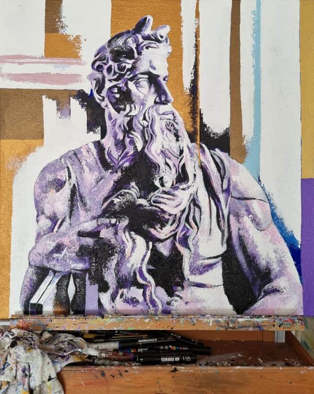 Le opere, realizzate attraverso la tecnica della pittura acrilica su tela, trattano temi legati al paesaggio, alla natura e ai suoi colori e allo studio del passato storico-artistico attraverso un omaggio a Michelangelo.