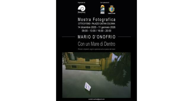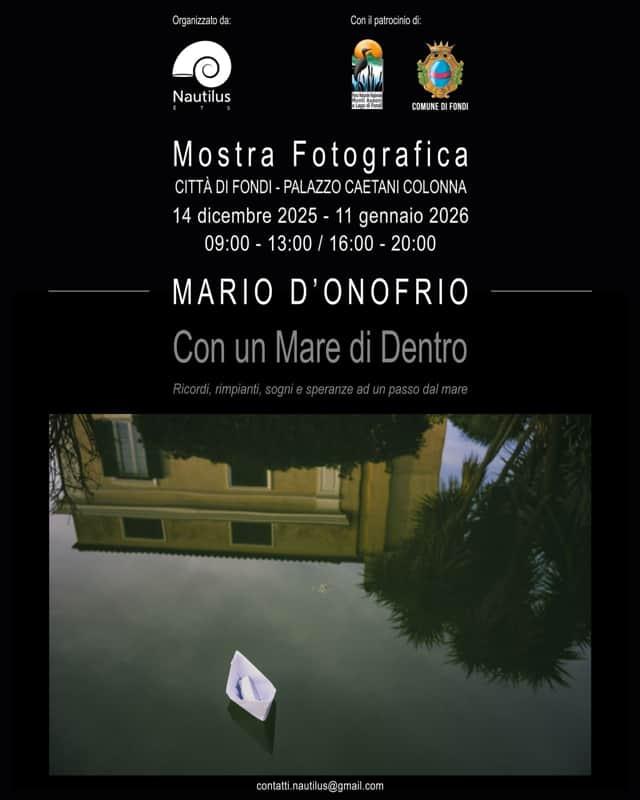 Si terrà dal 14 dicembre 2025 all’11 gennaio 2026, nei meravigliosi locali di Palazzo Caetani, la mostra fotografica “Con un mare di Dentro – ricordi, rimpianti, sogni e speranza ad un passo dal mare”. In esposizione, tutti i giorni dalle 9:00 alle 13:00 e dalle 16:00 alle 20:00, gli scatti di Mario D’Onofrio.