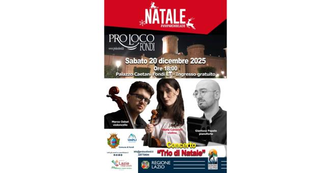 Con il Concerto “Trio di Natale” – dichiara il presidente della Pro Loco Fondi Gaetano Orticelli - vogliamo offrire alla comunità di Fondi e ai visitatori un momento di autentica bellezza e condivisione, capace di unire la magia del Natale alla valorizzazione del nostro straordinario patrimonio storico e culturale. Palazzo Caetani non è solo una cornice prestigiosa, ma un simbolo della nostra identità, che attraverso la musica torna a essere luogo vivo di incontro e partecipazione. Come Pro Loco Fondi continuiamo a credere che la cultura sia uno strumento fondamentale di crescita sociale e di promozione del territorio. Invito cittadini e turisti a partecipare numerosi, per condividere insieme momenti di musica, emozioni e tradizione, riscoprendo il piacere di stare insieme nel cuore della città di Fondi.