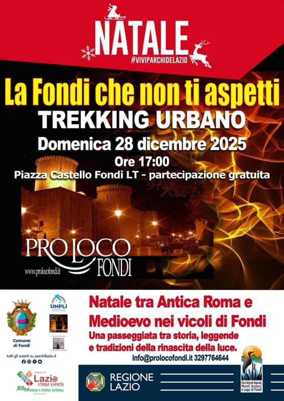 Fondi si prepara a vivere un appuntamento speciale nel cuore delle festività natalizie con “La Fondi che non ti aspetti – Trekking urbano”, un evento che unisce cultura, tradizioni e scoperta del territorio. L’iniziativa si terrà domenica 28 dicembre 2025, con ritrovo alle ore 17:00 sotto il Castello in piazza Unità d'Italia, e sarà gratuita e aperta a tutti.