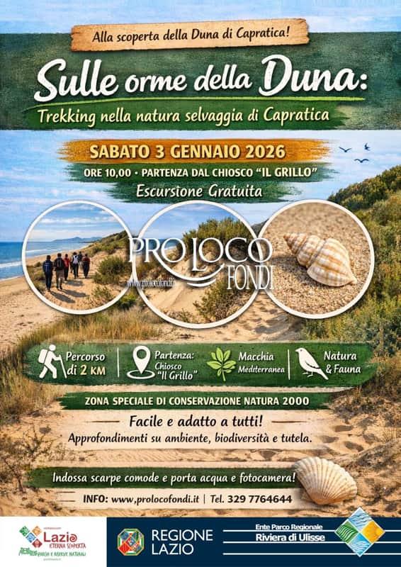 La Pro Loco Fondi APS presenta l’iniziativa “Sulle orme della duna: trekking nella natura selvaggia di Capratica”, un evento gratuito e aperto a tutti che si svolgerà sabato 3 gennaio 2026 con ritrovo alle ore 10,00 nella splendida cornice della Duna di Capratica, all’interno del Parco Naturale Regionale Riviera di Ulisse.