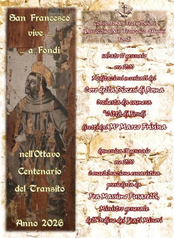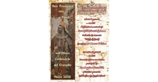 In questo contesto spirituale e culturale di straordinaria rilevanza, la Fraternità dei Frati Minori, attestata, presso la città di Fondi, fin dai tempi in cui Francesco d’Assisi era ancora vivente, che anima pastoralmente l’omonima Parrocchia, in piena sintonia con l’Arcidiocesi di Gaeta ed in collaborazione con le diverse realtà ecclesiali e culturali del territorio, inaugura ufficialmente l’Anno Centenario nella città di Fondi: “San Francesco vive… a Fondi” nell’ottavo centenario del Transito.