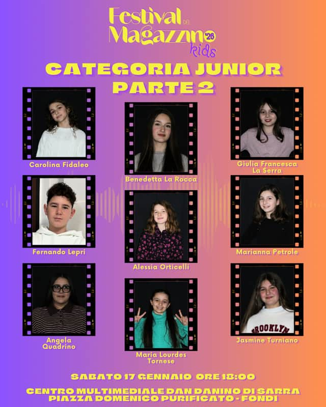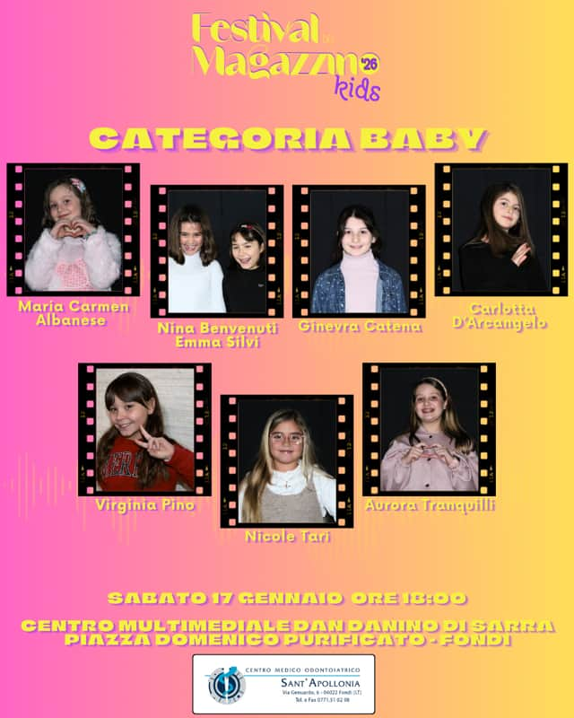 Saranno ben 24 i giovanissimi cantanti provenienti da tutto il sud pontino che si alterneranno sul palco, divisi in due fasce d’età. Per la categoria baby (6-9 anni): Maria Carmen Albanese, Nina Benvenuti & Emma Silvi, Ginevra Catena, Carlotta D’Arcangelo, Virginia Pino, Nicole Tari e Aurora Tranquilli. Per la categoria Junior (10-13 anni): Adele Agovino, Ilenia Caprio, Matilde Cataldi, Domitilla Centola, Greta De Gregoris, Francesco Di Fazio, Gioele Di Martino, Giulia Maria Di Mugno, Carolina Fidaleo, Benedetta La Rocca, Giulia Francesca La Serra, Fernando Lepri, Alessia Orticelli, Marianna Petrole, Angela Quadrino, Maria Lourdes Tornese, Jasmine Turniano.