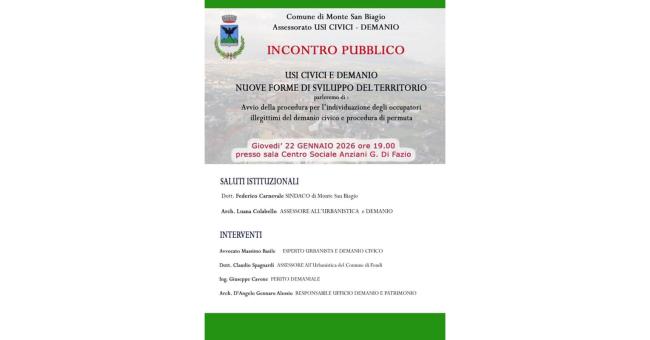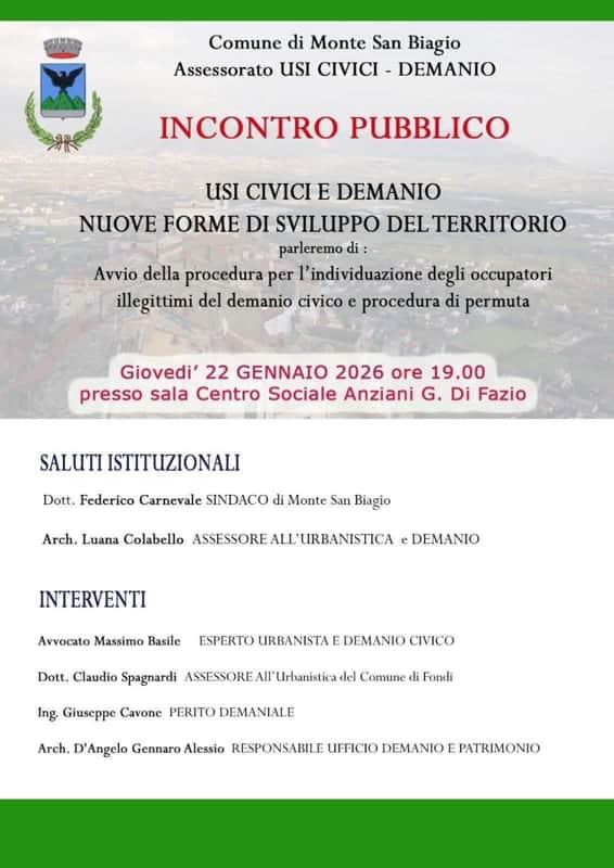 Si terrà giovedì 22 gennaio 2026, alle ore 19.00, presso la sala del Centro sociale anziani “G. Di Fazio”, l’incontro pubblico promosso dal Comune di Monte San Biagio dal titolo “Usi civici e demanio – nuove forme di sviluppo del territorio”.